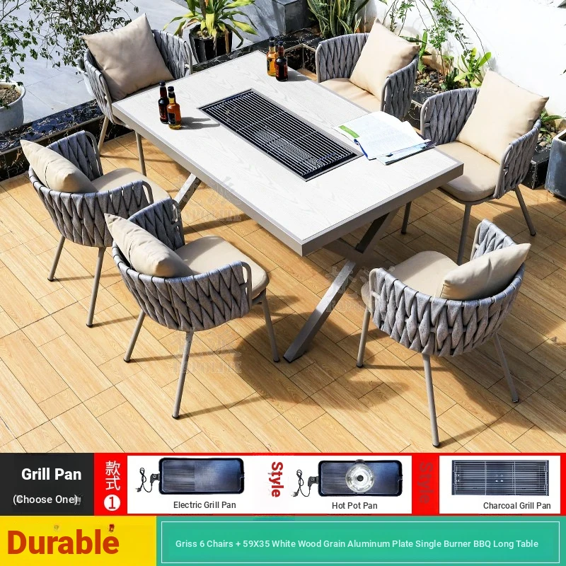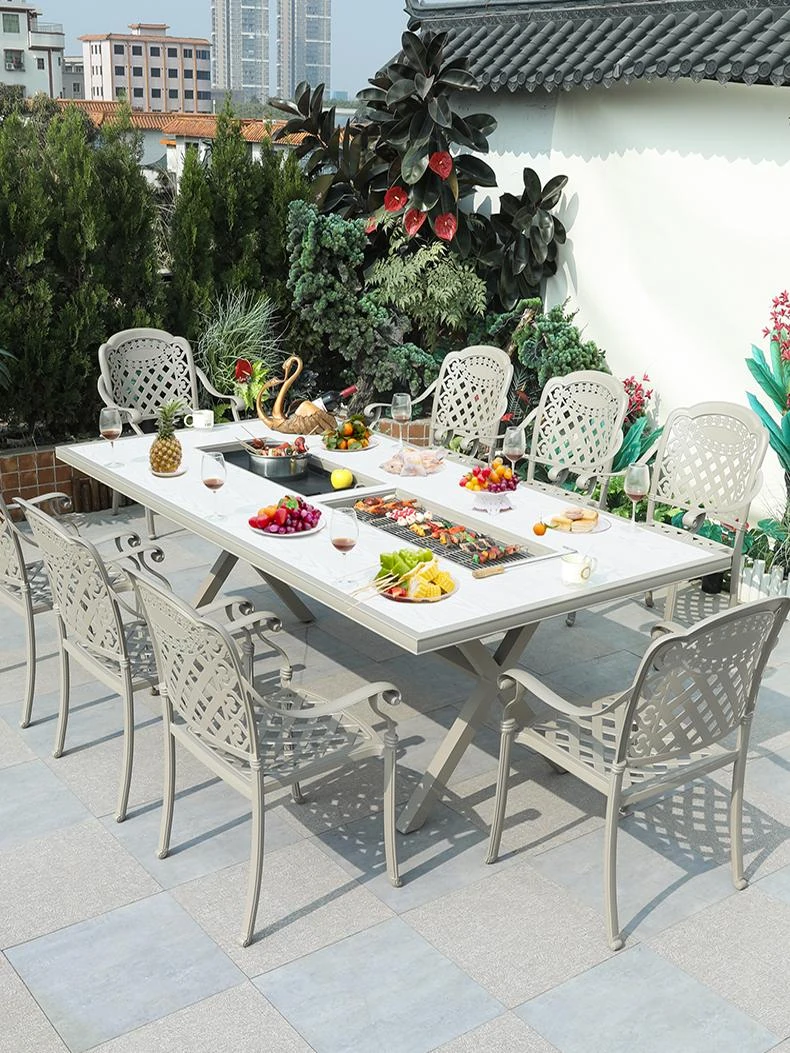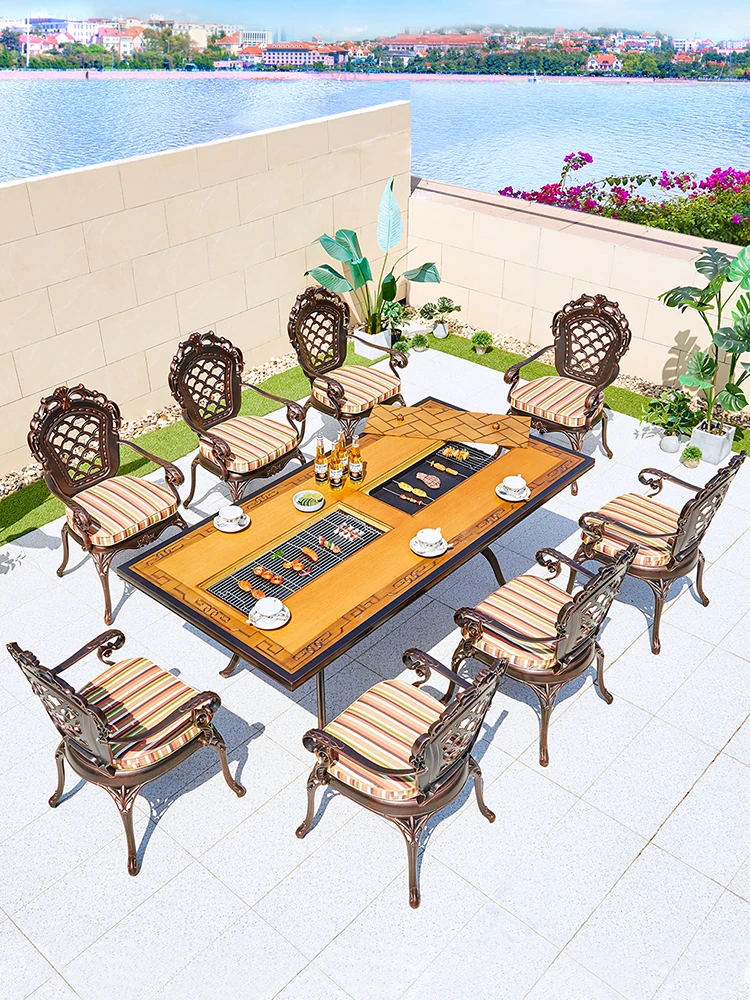 Outdoor Patio BBQ Table Set - Cast Aluminum Dining Table and Chairs for Villa Balcony - Smokeless Self-Grilling Table for Backyard Enjoyment