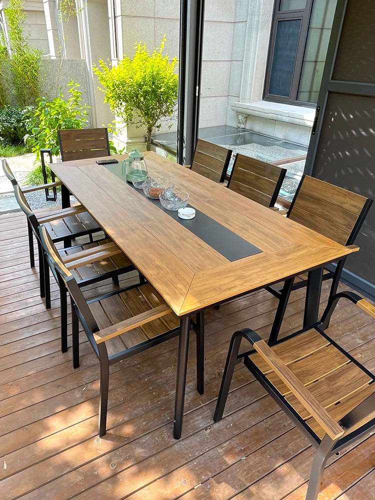 Luxury Outdoor Villa Dining Set - Weatherproof and Sun-Resistant Aluminum Alloy Patio Table and Chairs for Courtyards, Featuring Stylish Plastic-Wood Long Table and Bar Stools. Perfect for Entertaining in Your Backyard!