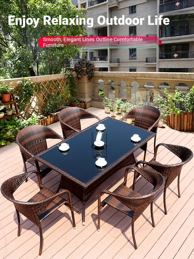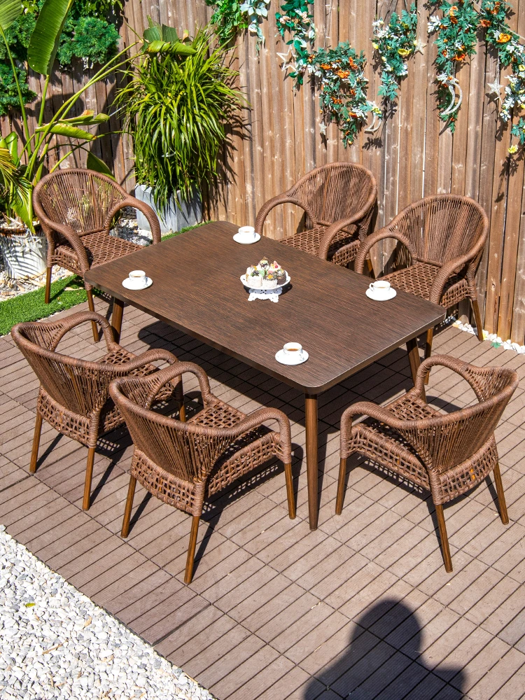 Vanpai Outdoor Dining Furniture Set - Elegant Long Dining Table with Comfortable Back Chairs for Courtyards, Gardens, and Villas - Perfect Rattan Tea Table and Chair Combination for Outdoor Relaxation
