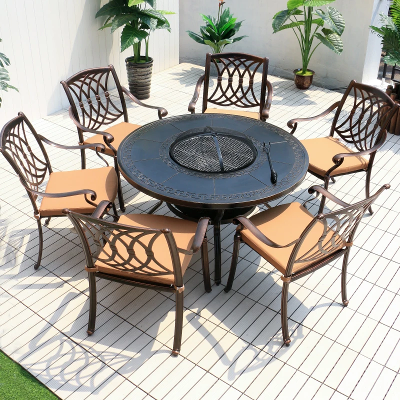 Outdoor BBQ Dining Set - Stylish Patio Table and Chair Combo for Villas and Balconies, Perfect for Al Fresco Gatherings with Charcoal and Electric Grills, Durable Cast Aluminum Construction for Home Use.