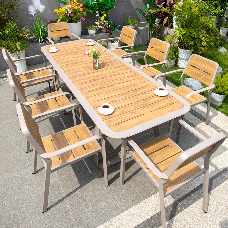 VANPA Outdoor Patio Plastic Wood Long Dining Table and Chair Set - Stylish and Durable Waterproof Sun-Resistant Furniture for Your Backyard Dining Experience