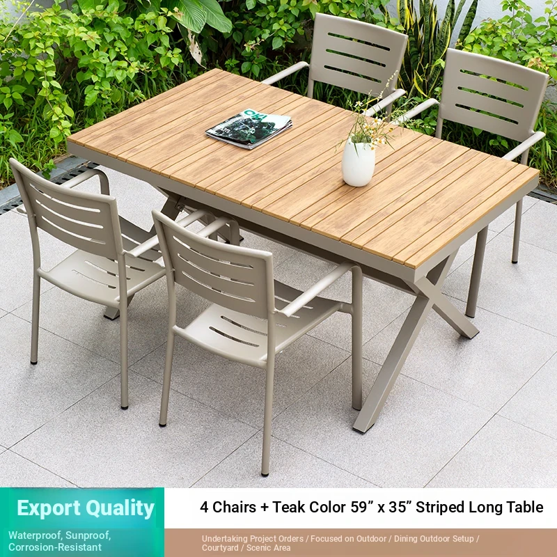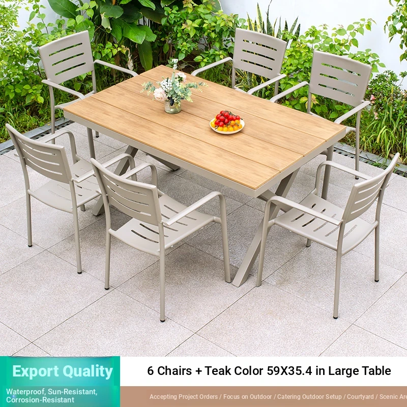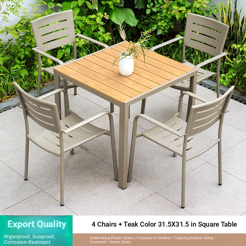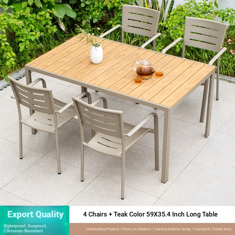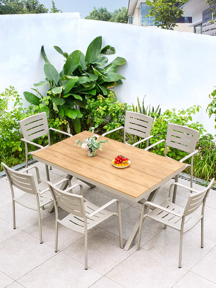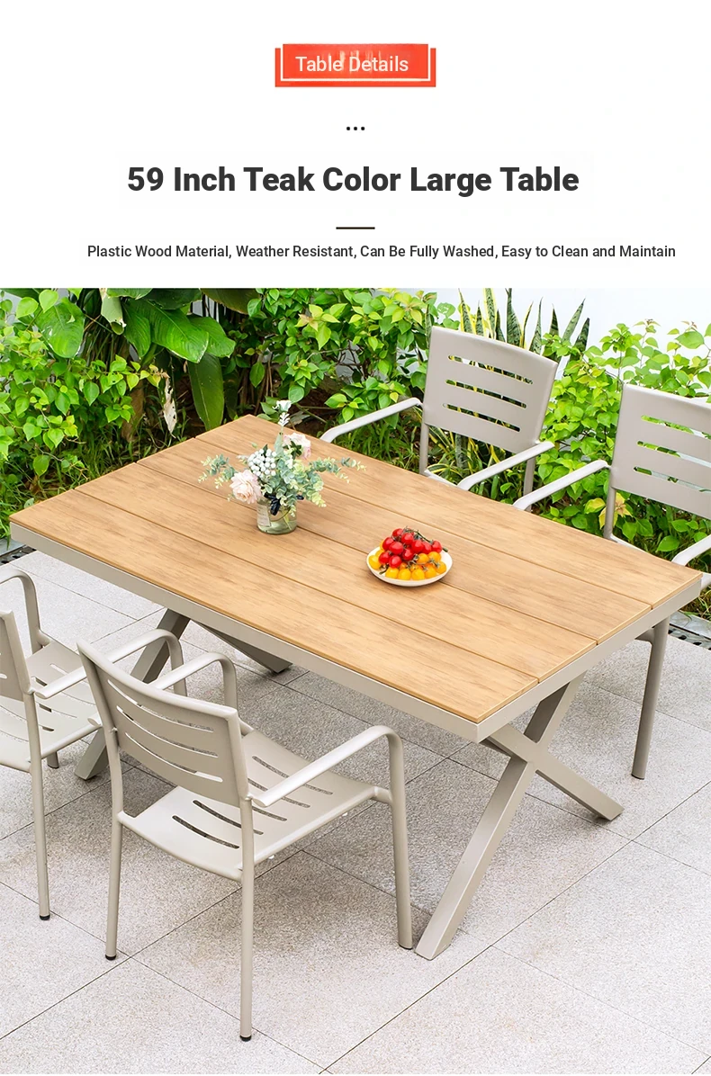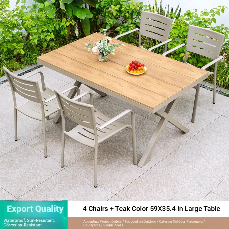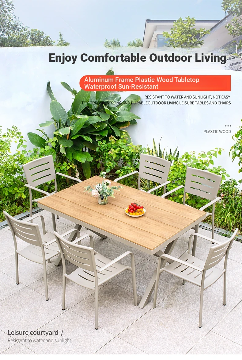 Outdoor Waterproof and UV-Resistant Plastic Wood Patio Furniture Set - Aluminum Alloy, Corrosion-Resistant Dining Table and Chairs for Villa Courtyards and Terraces, Perfect for Relaxing Outdoors!
