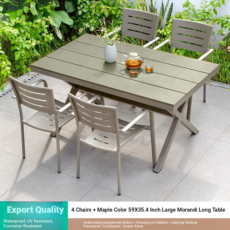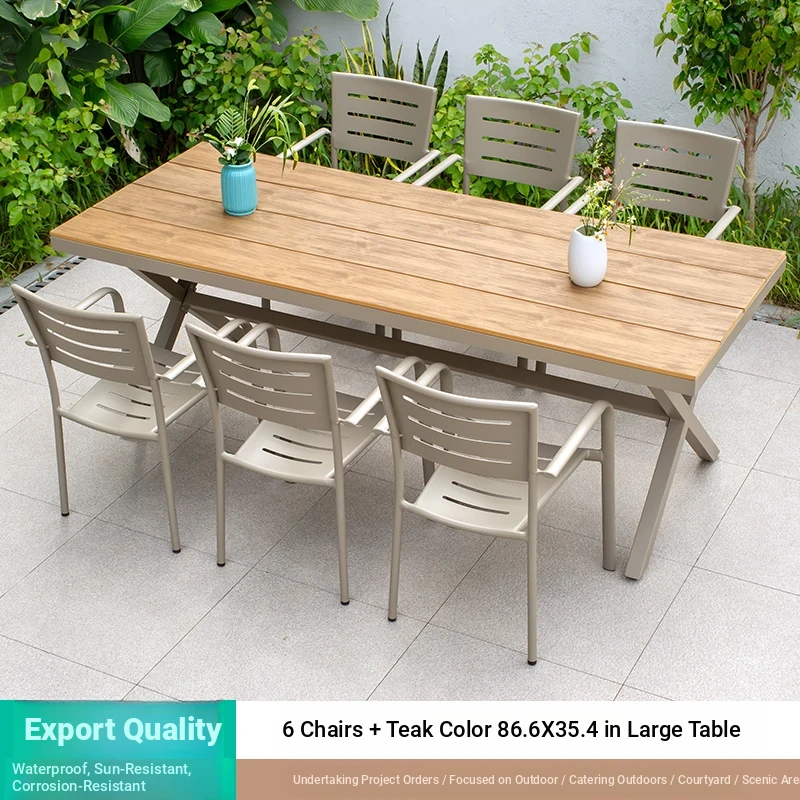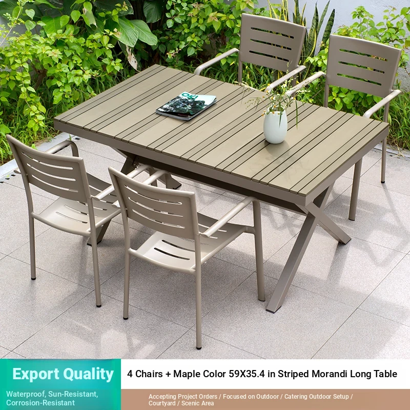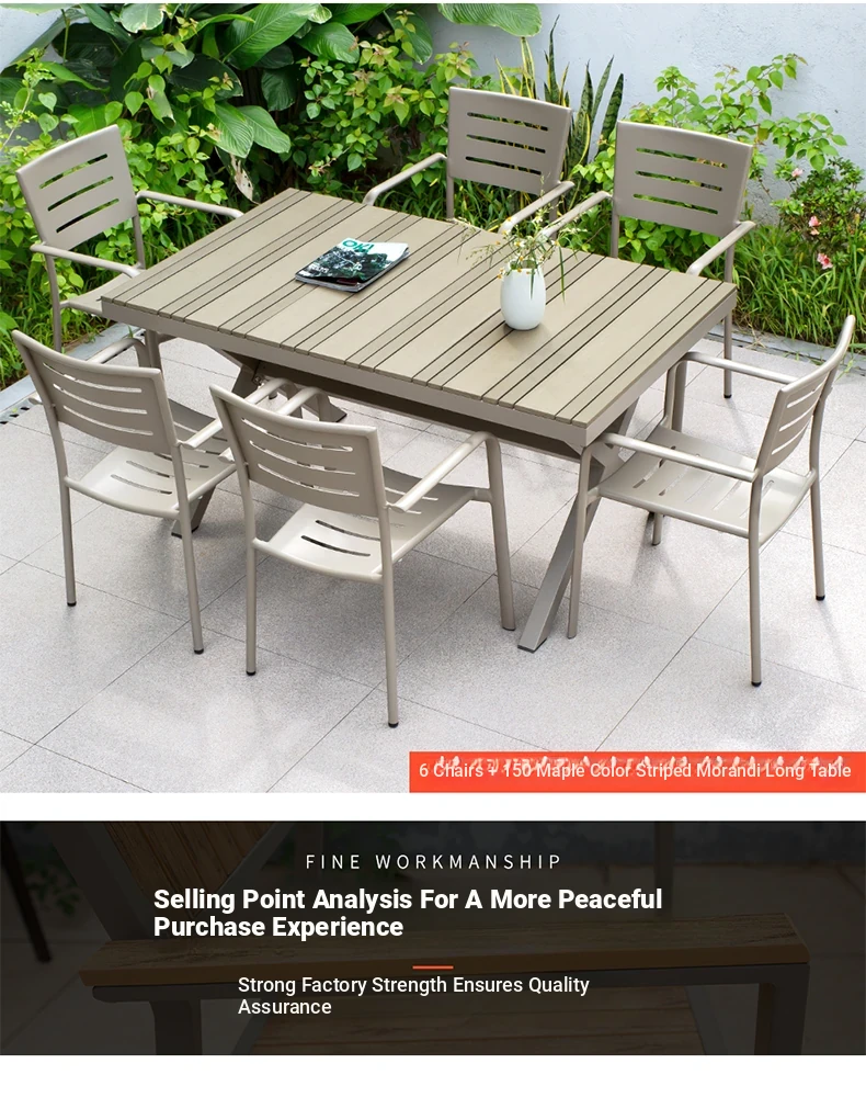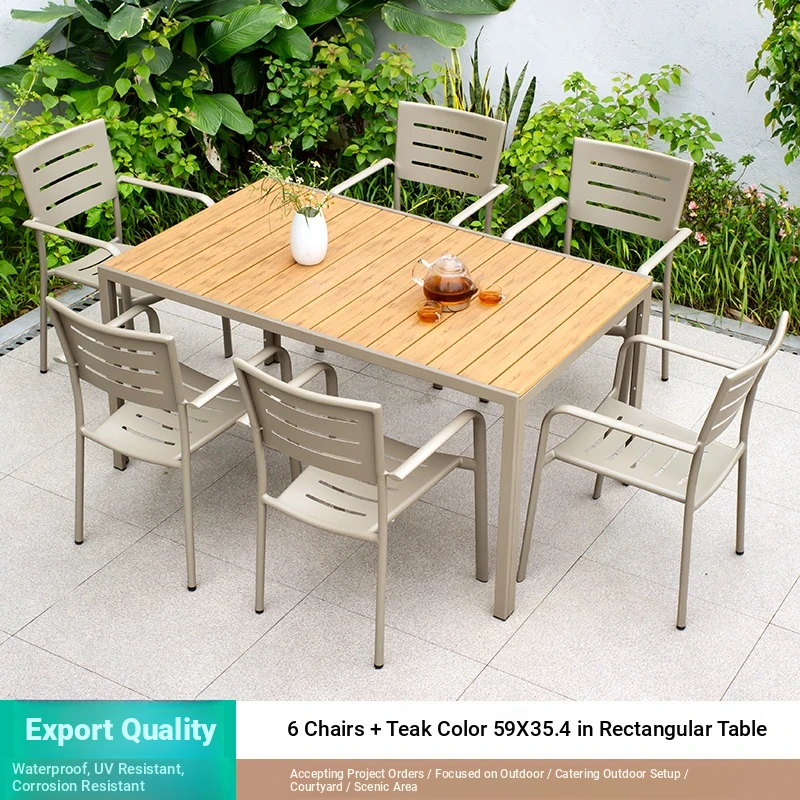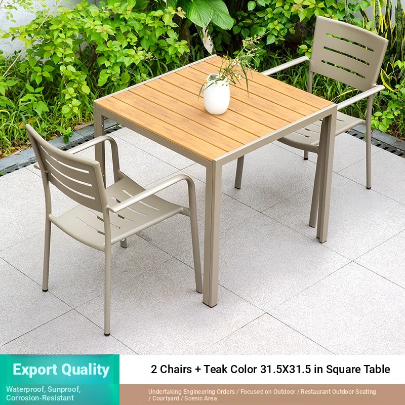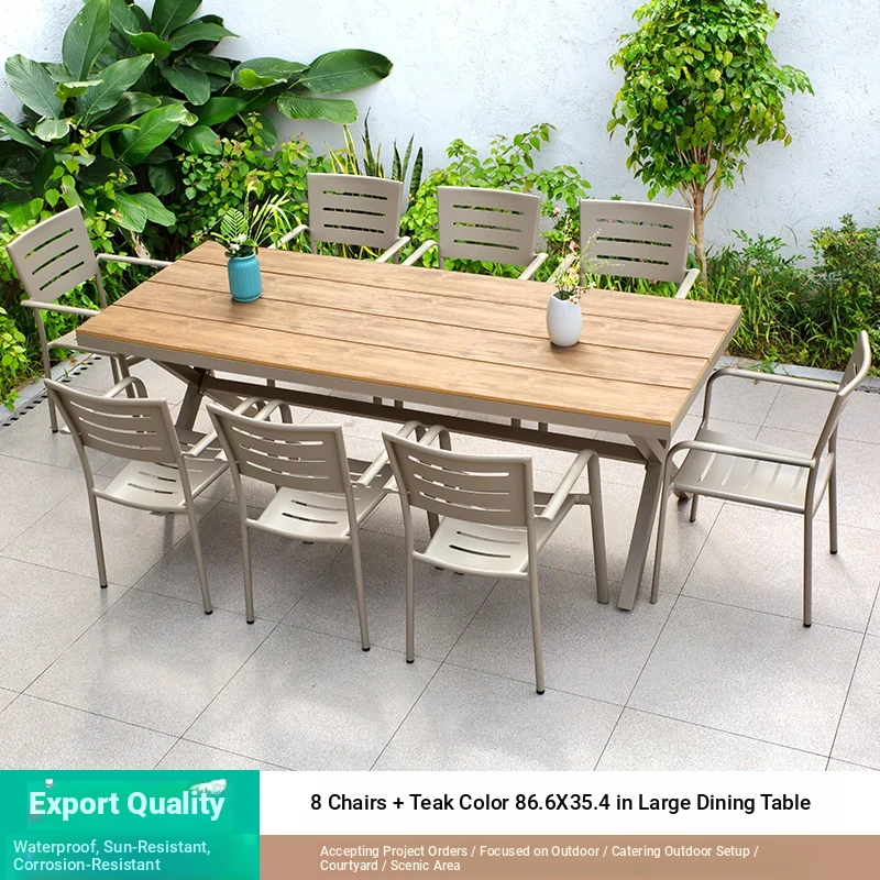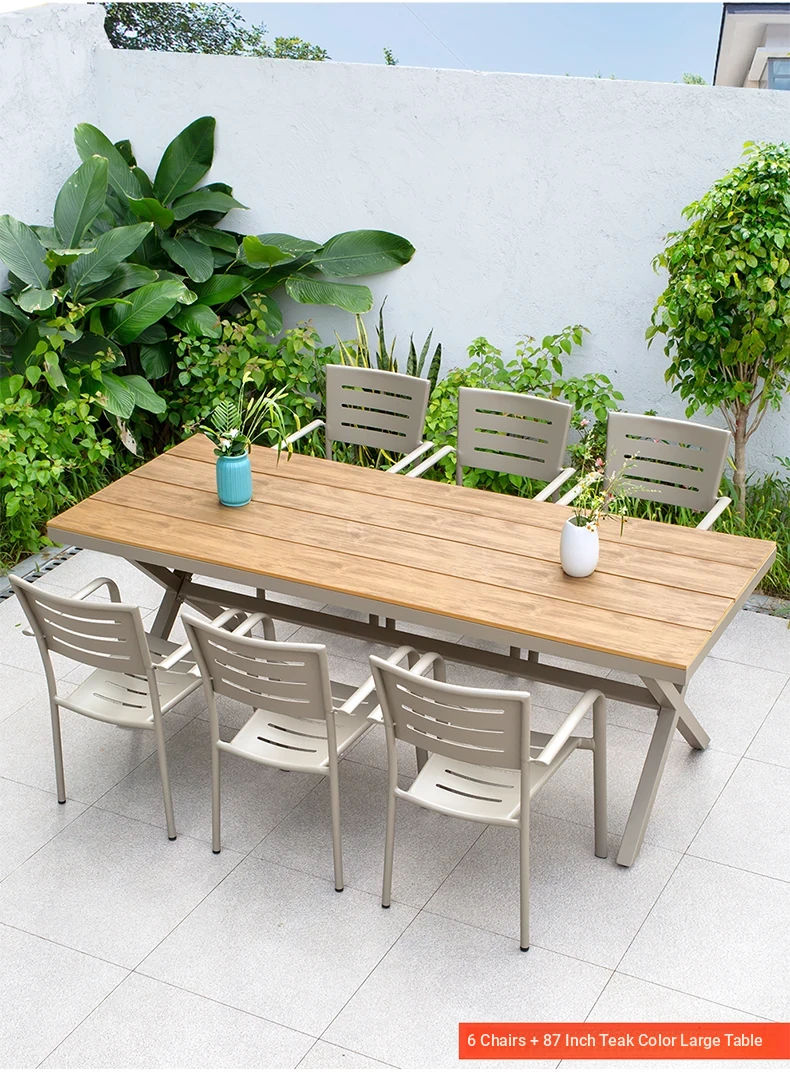 Outdoor Waterproof and UV-Resistant Plastic Wood Patio Furniture Set - Aluminum Alloy, Corrosion-Resistant Dining Table and Chairs for Villa Courtyards and Terraces, Perfect for Relaxing Outdoors!