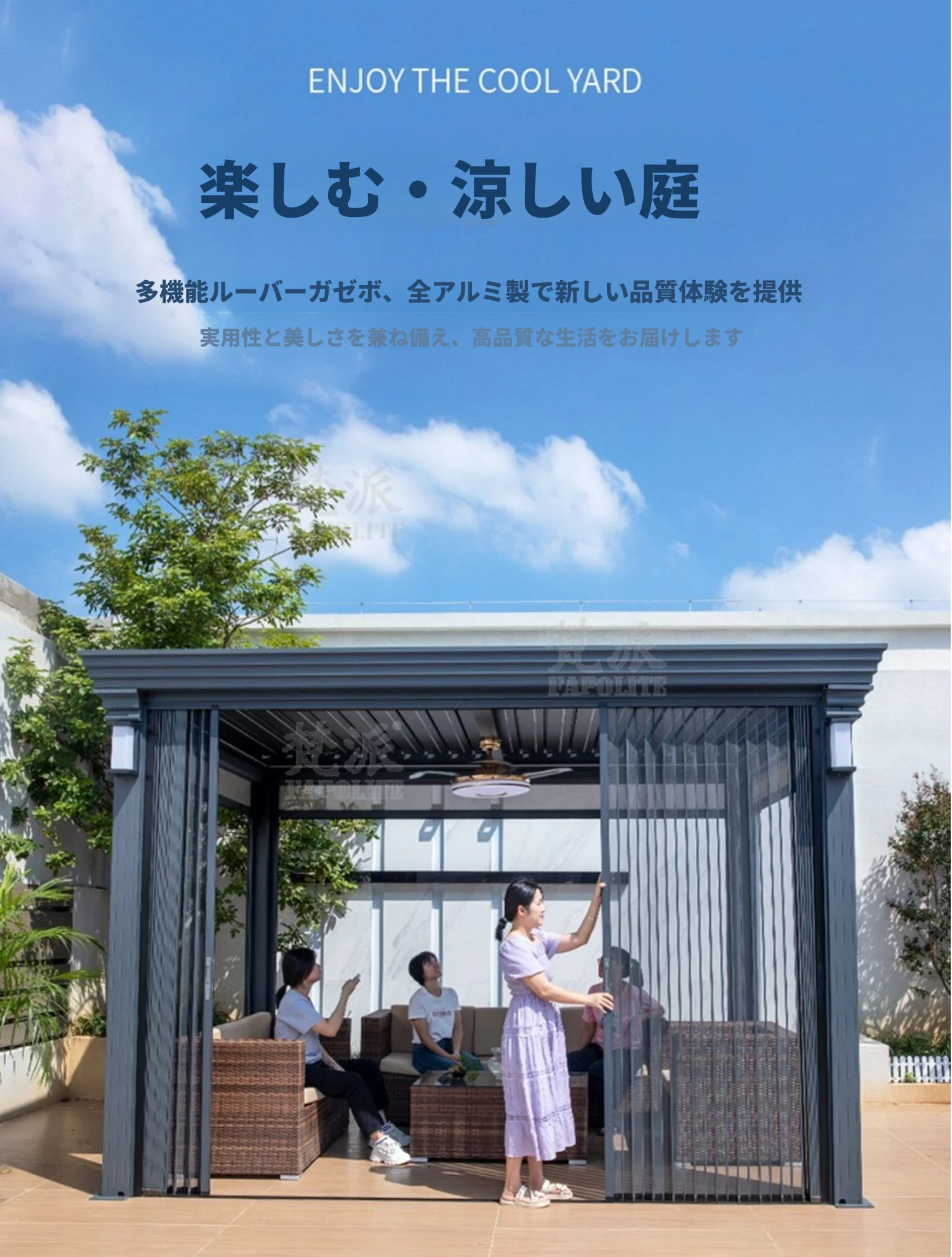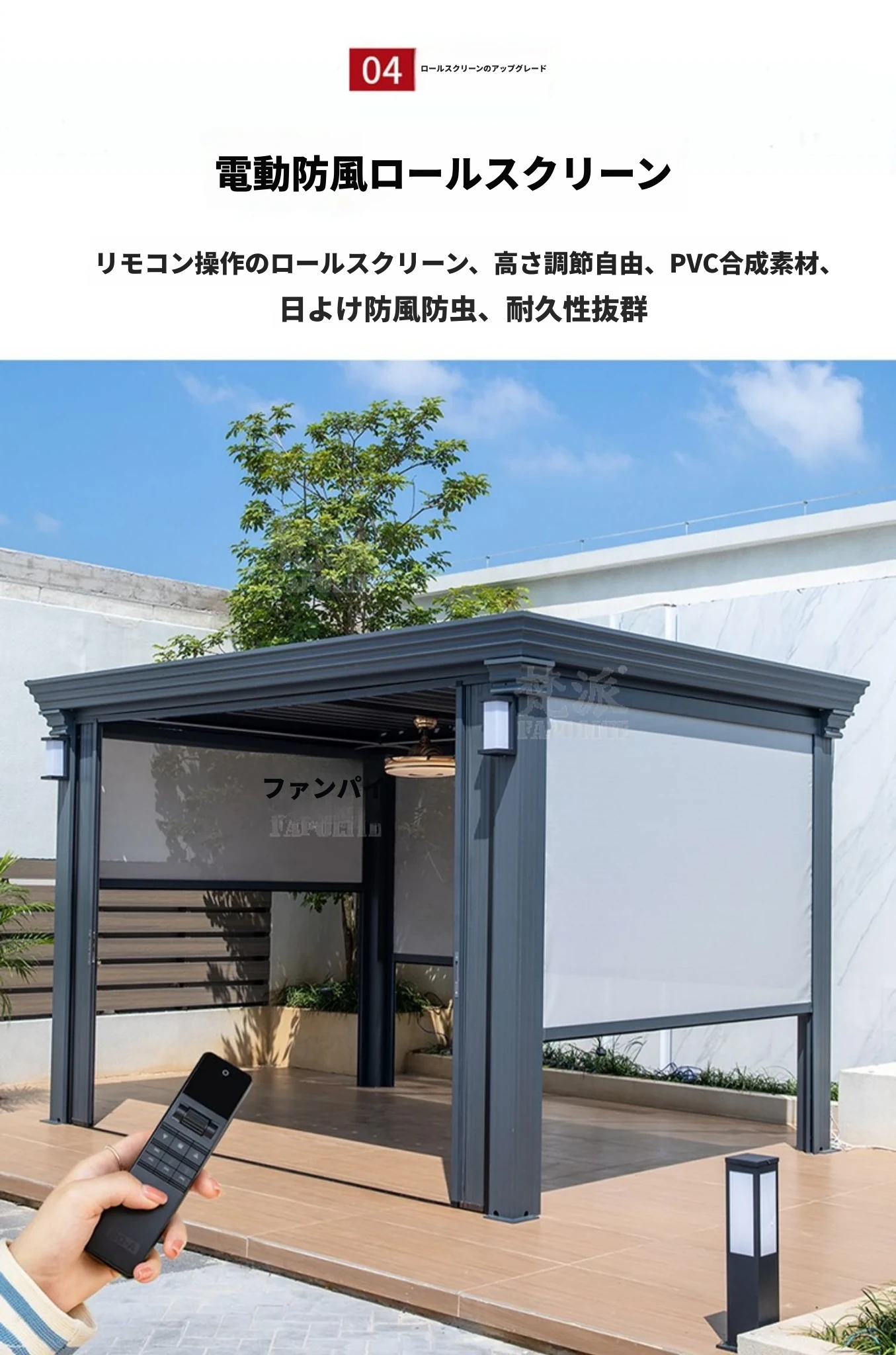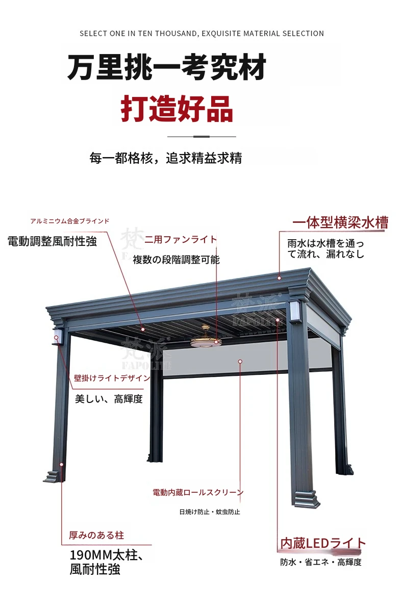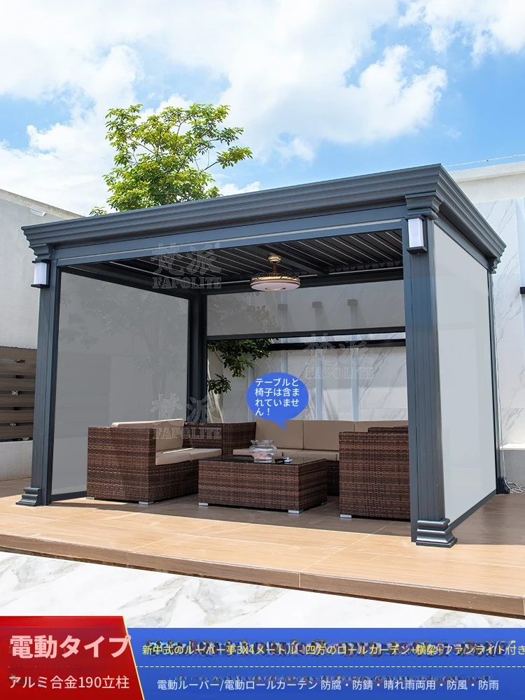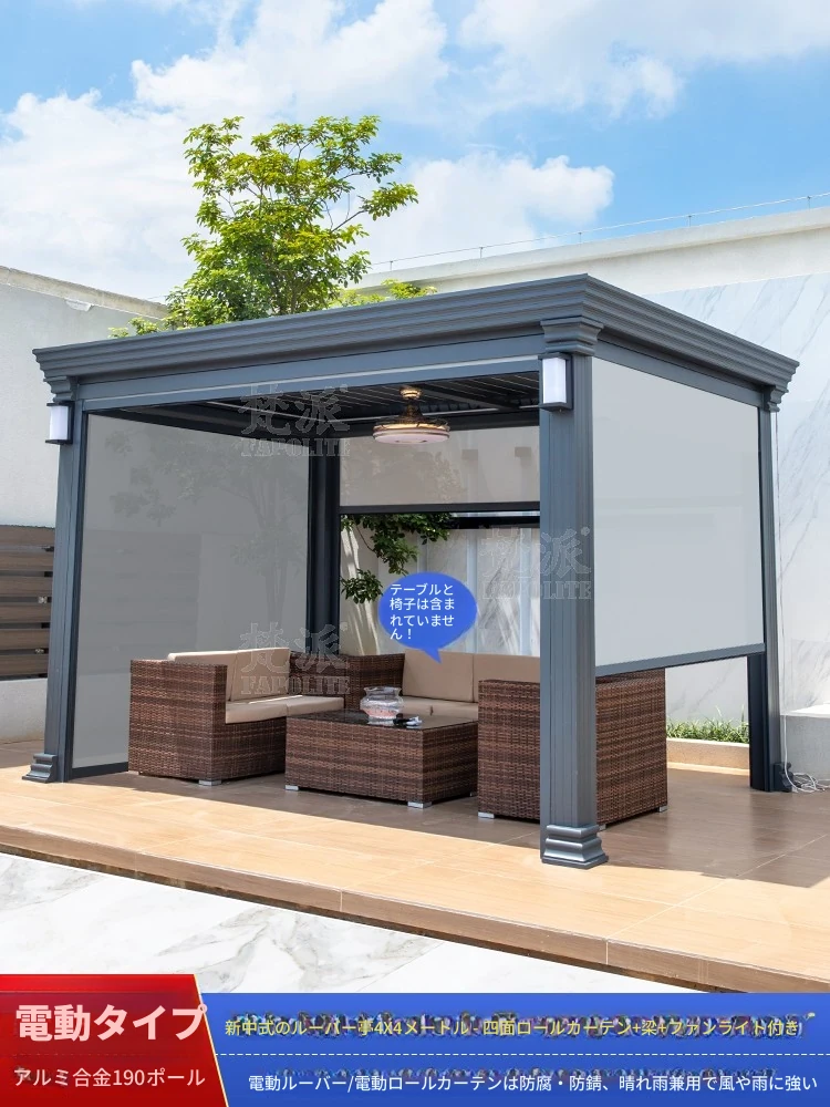 中式バイエティー亭-電動タイプ4X4メートル-四面ロールカーテン付き+横梁+ファンライト