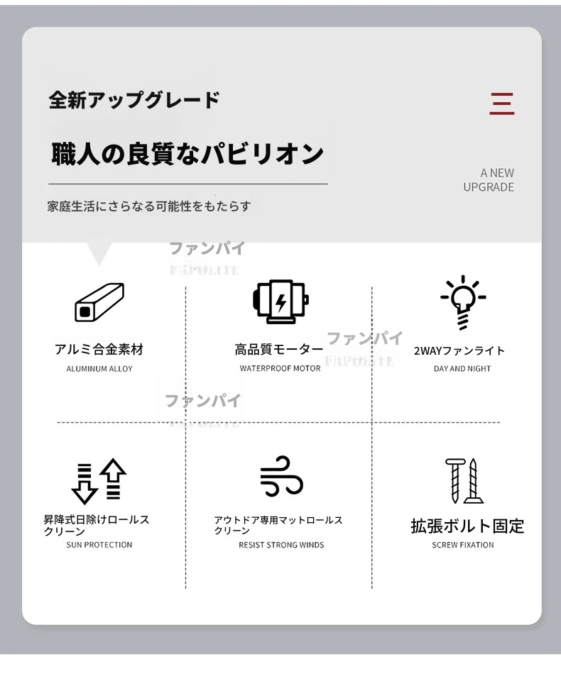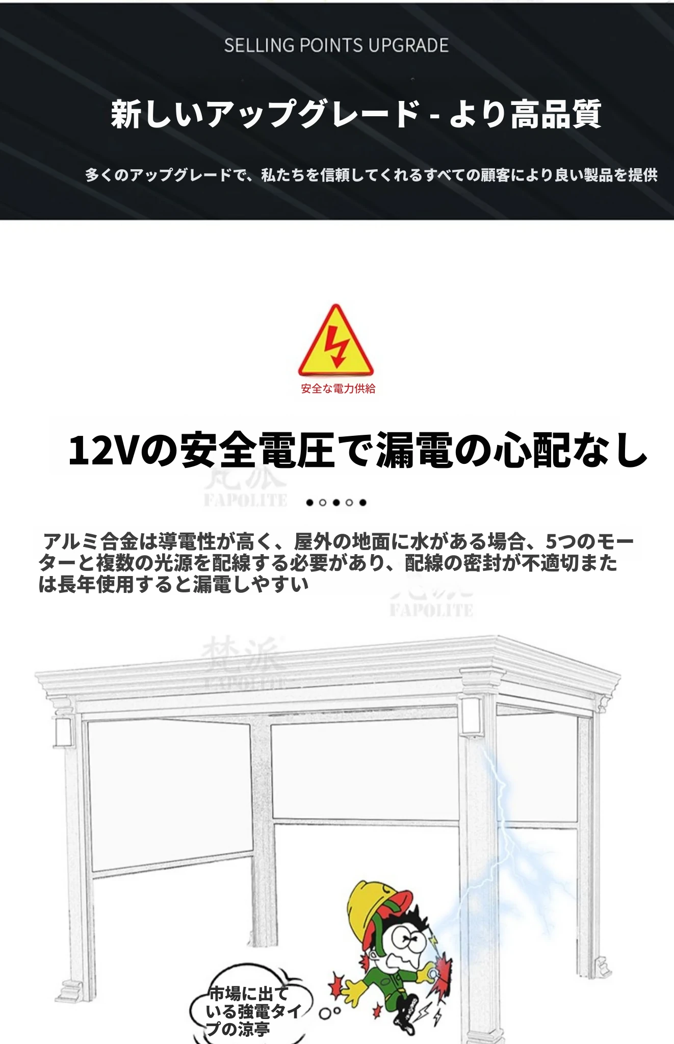 現代バイエティー亭-電動タイプ3X3メートル-四面ロールカーテン付き+横梁+ファンライト