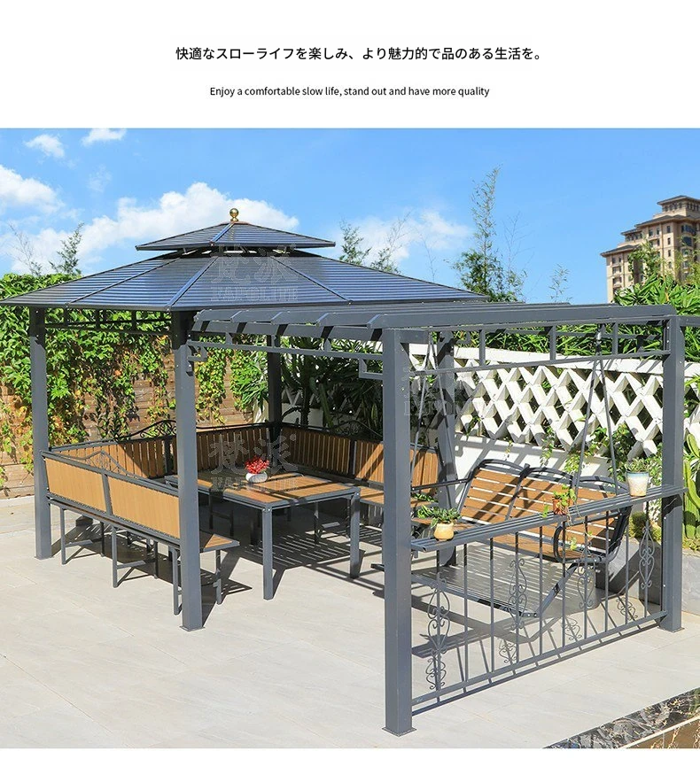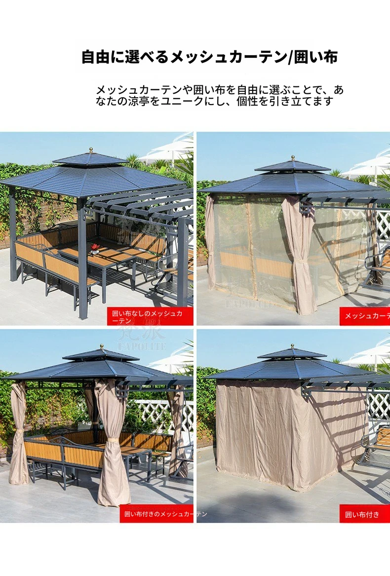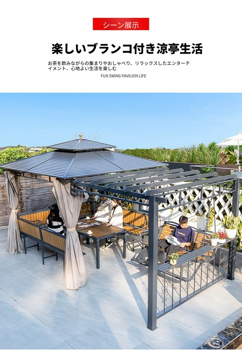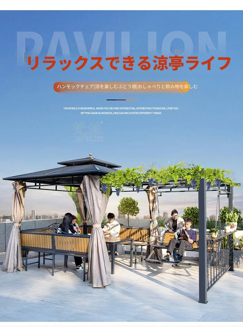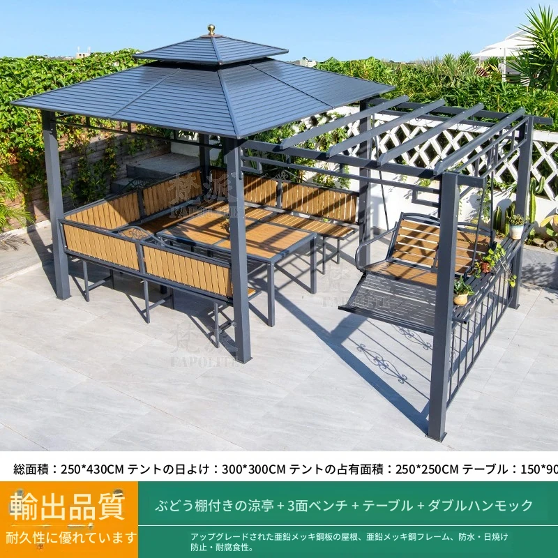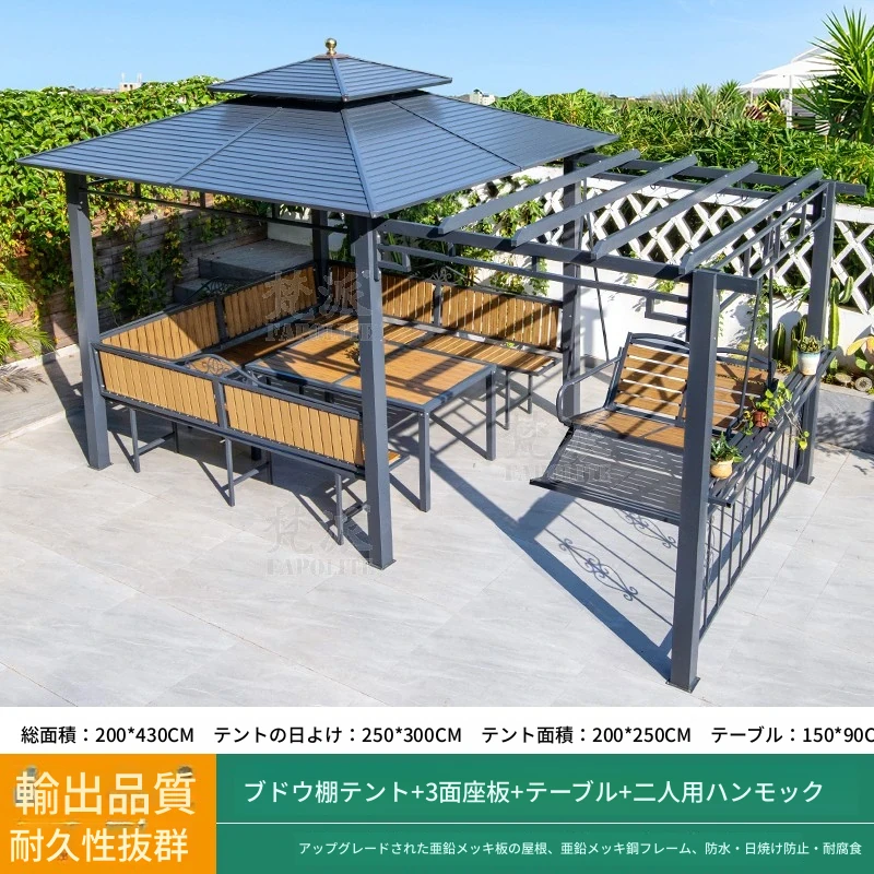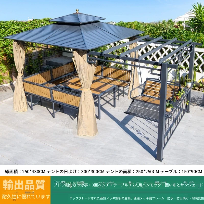 【占有面積4.3x2.5メートル】ぶどう棚テント+3面の座板+テーブル+2人用ハンモック+囲い布のカーテン