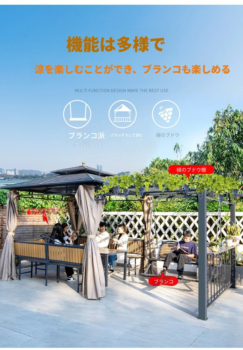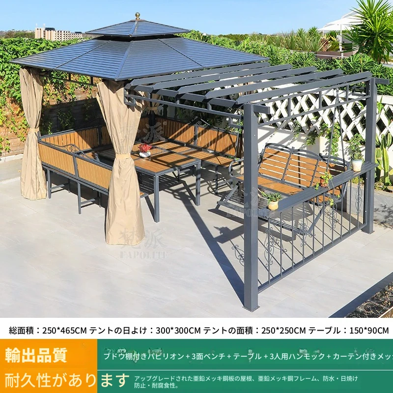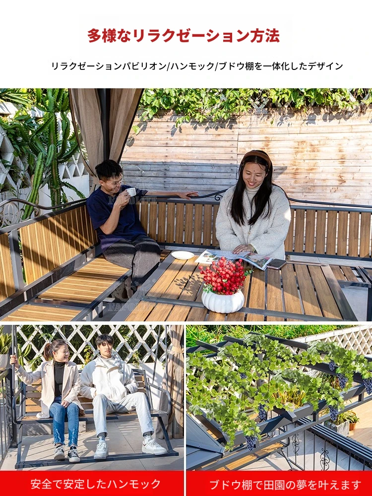 【占有面積4.65x2メートル】ぶどう棚テント+3面の座板+テーブル+3人用ハンモック+囲い布のカーテン