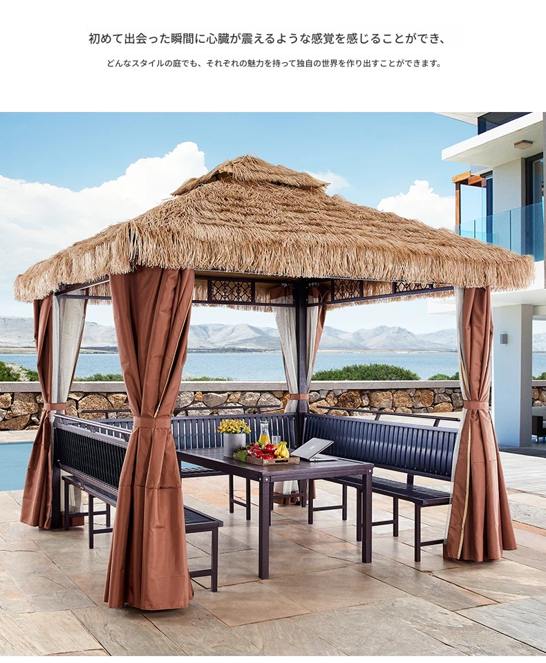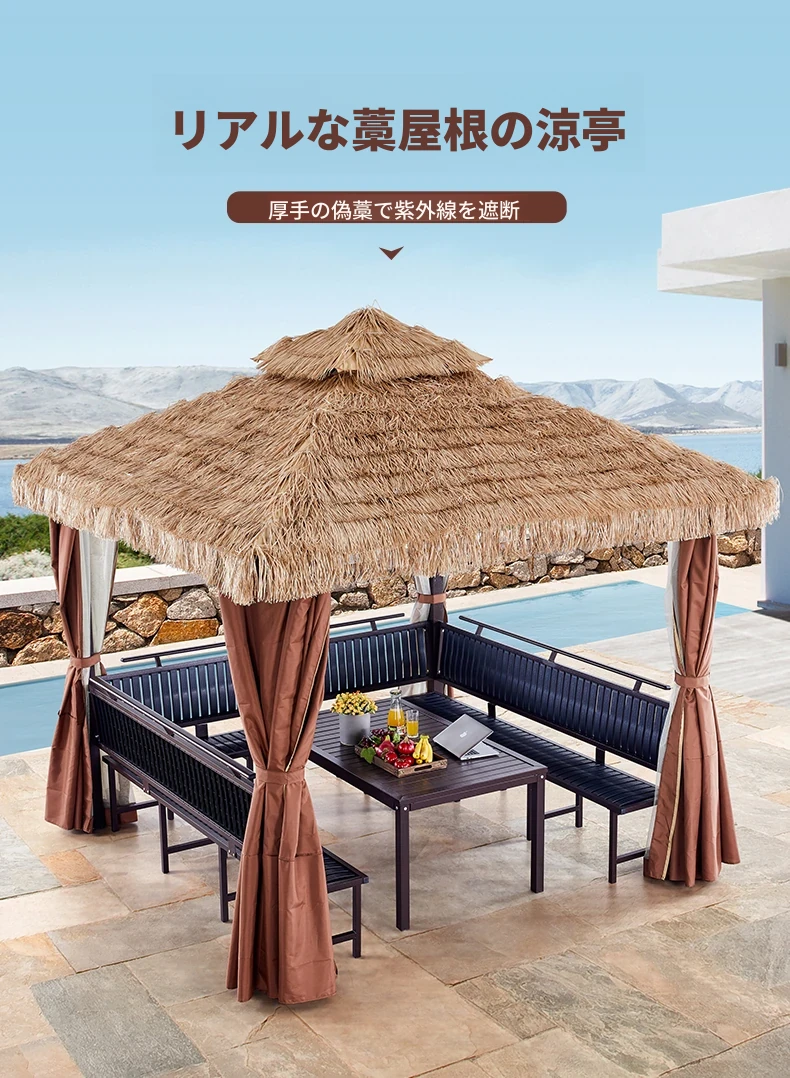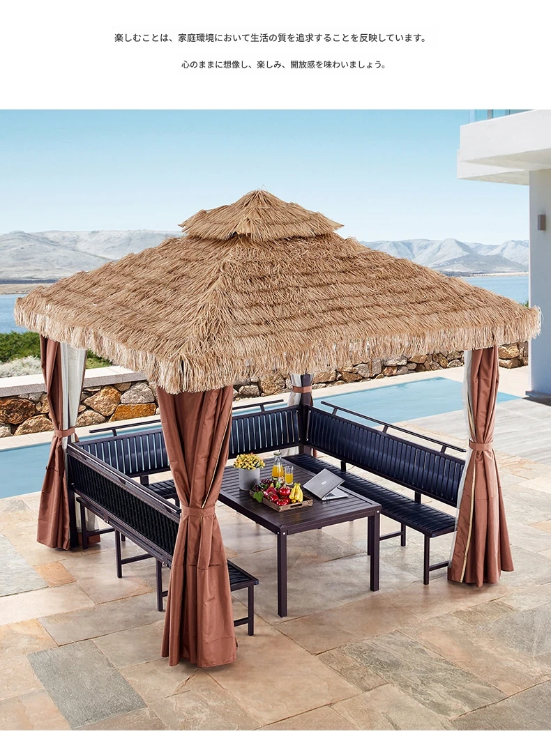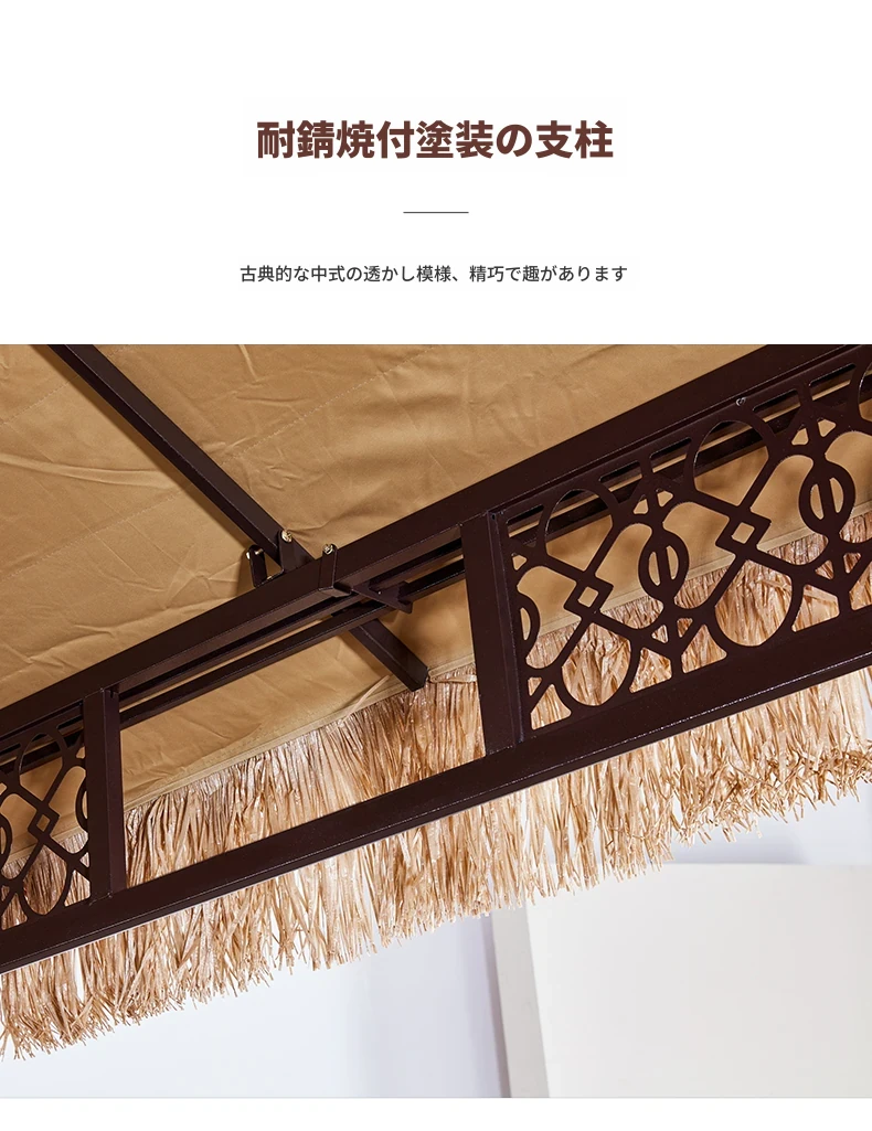 アウトドアパビリオン 防腐木製 四隅の日よけ 中華風ガーデンシェード 簡易農家風 茅葺きテントで、あなたの庭をオシャレに演出!快適な日差しを遮り、リラックス空間を提供します。