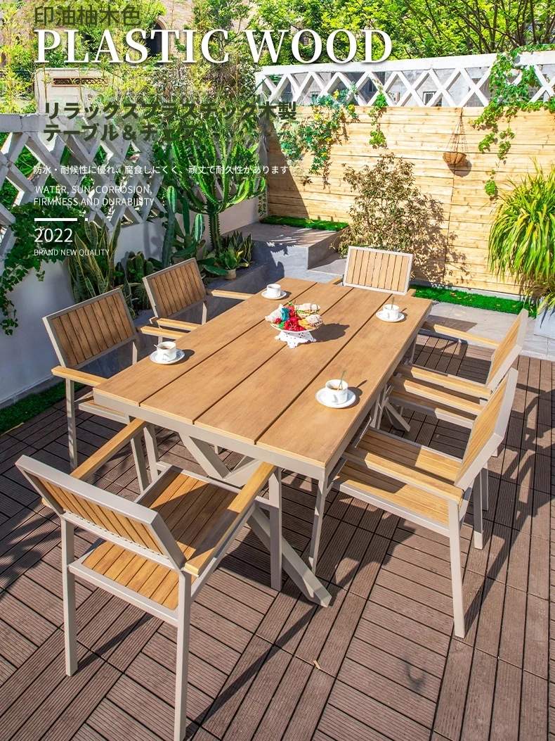 防腐木製の屋外テーブルセット - おしゃれな庭やバルコニーに最適!アルミ合金と防水プラスチック木材で、耐久性と快適さを兼ね備えたリラックス空間を実現。あなたのアウトドアライフをもっと楽しく!