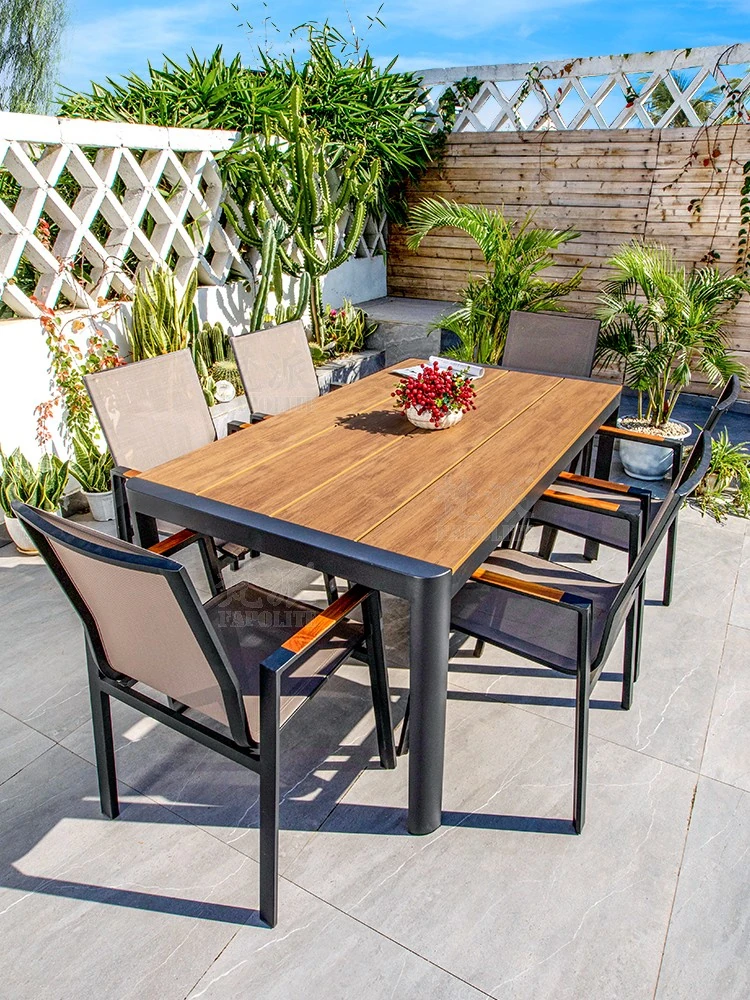 アルミ合金フレームのアウトドアテーブル&チェアセット - プラスチックウッド製、庭やバルコニーに最適なリラックスチェア!おしゃれで耐久性抜群、屋外での食事やくつろぎタイムを楽しむための必需品です。