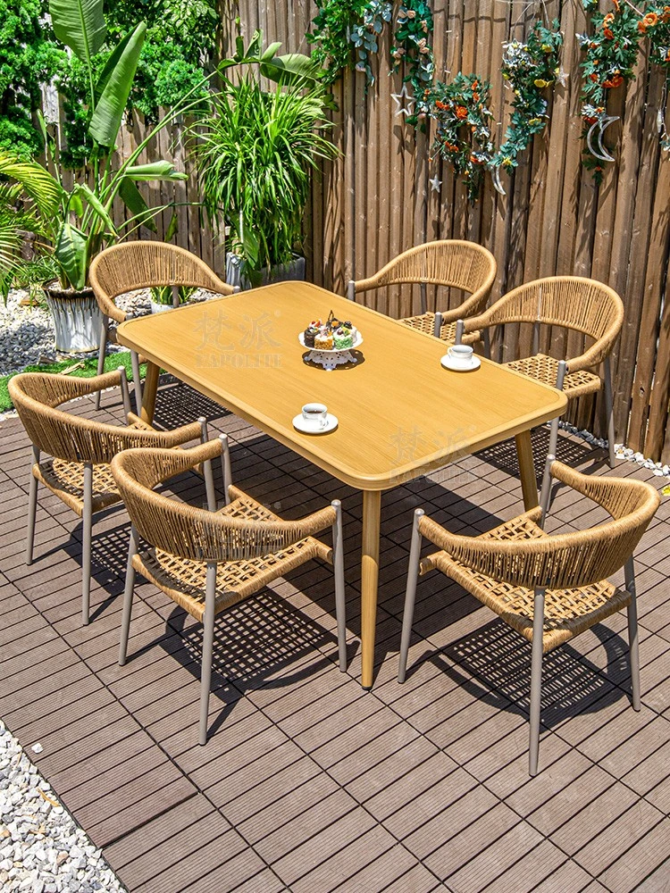 梵派アルミ合金製屋外防腐木製テーブル・椅子セット|プラスチック木材使用の防水中華スタイルのバルコニー用ティーテーブル・チェア|快適な庭でのリラックスタイムに最適!