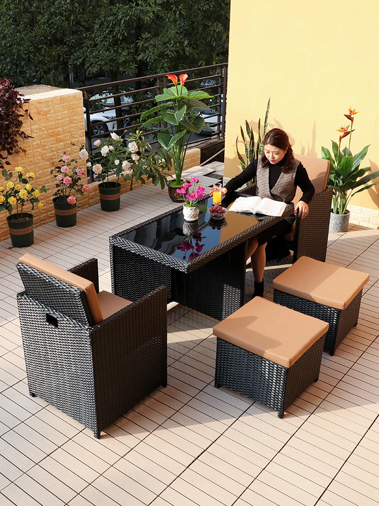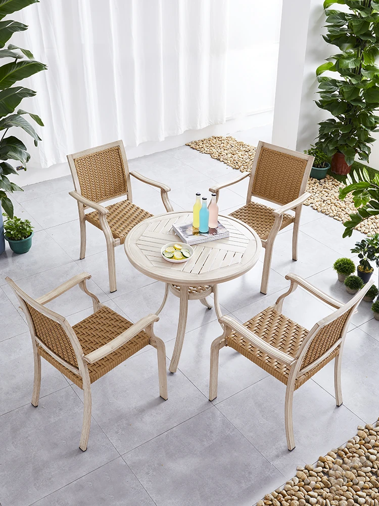 北欧風の軽やかなラグジュアリー!岩板製のアウトドア用ダイニングチェアとテーブルセット。おしゃれな庭やバルコニーに最適な編み込みデザインで、モダンなリラックス空間を演出します。あなたのヴィラで特別なひとときを!