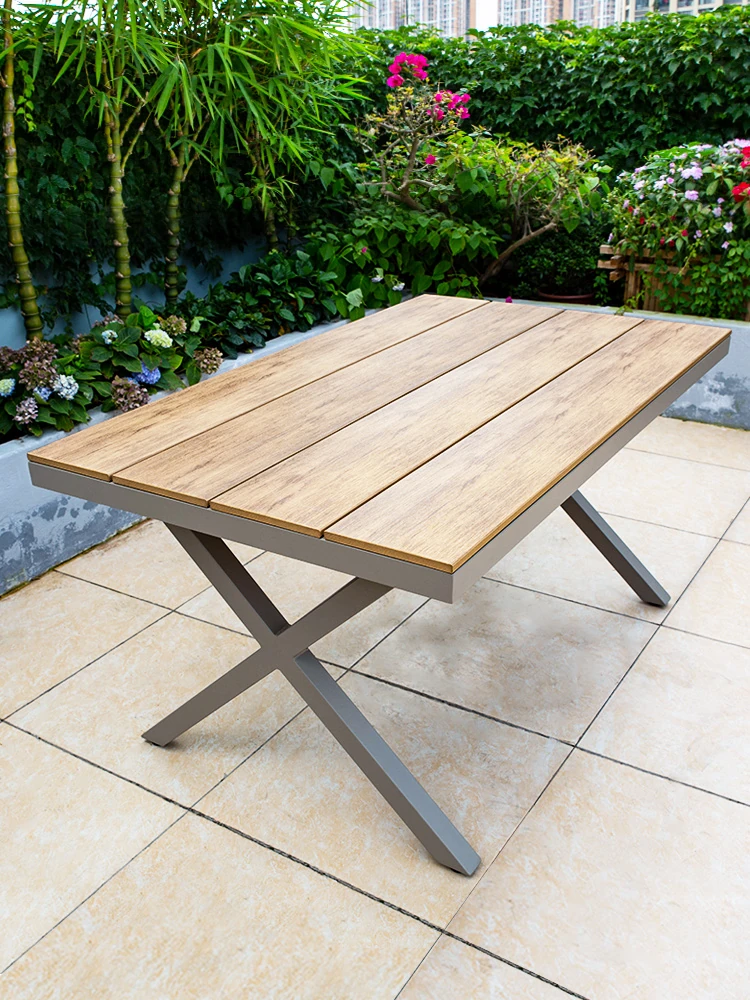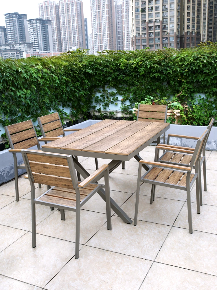 アウトドア用プラスチック木製テーブル&チェアセット - 庭やバルコニーに最適!アルミ合金製のシンプルでエレガントな欧州スタイル、伸縮式ダイニングテーブルで快適なひとときを楽しもう。