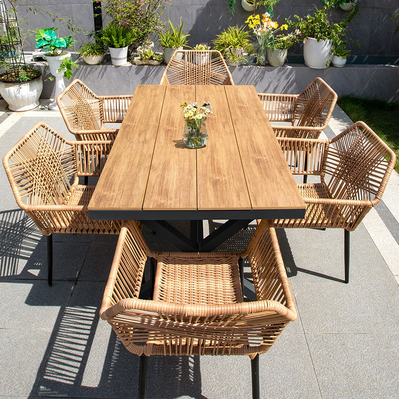 ヴァンパイ アウトドア プラスチックウッド ダイニングテーブルセット - 藤編みソファチェア付き、別荘や庭に最適!防水設計で、リラックスした屋外でのひとときを提供します。